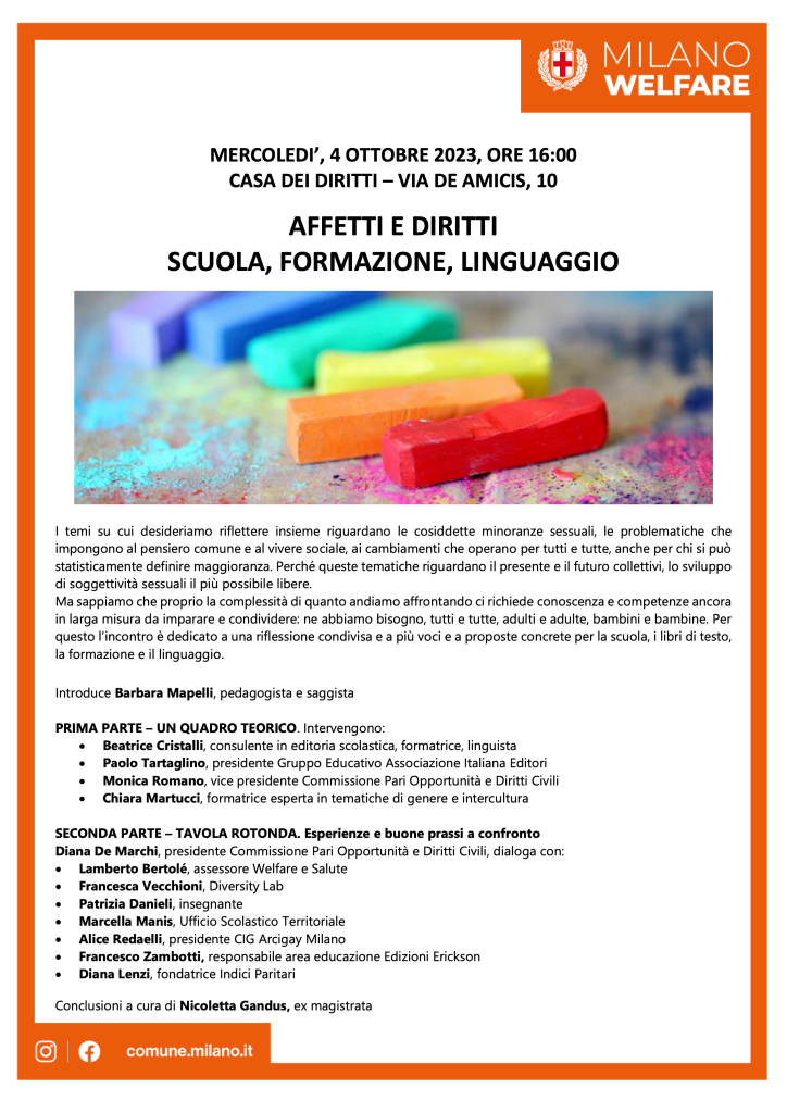 Mercoledì 4 ottobre alle ore 16:00 sarò alla Casa dei Diritti di Milano per parlare di riconoscimento e valorizzazione delle diversità a scuola.